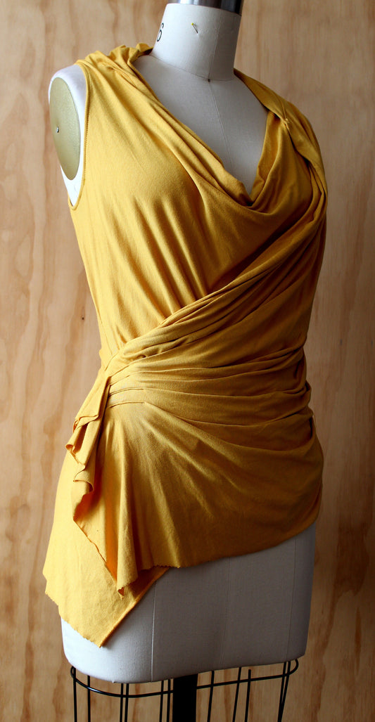 Mustard yellow with ruching and cowl neck/ side drape back with stitch detail / raw edge/color may not be available' inquire/ free shipping