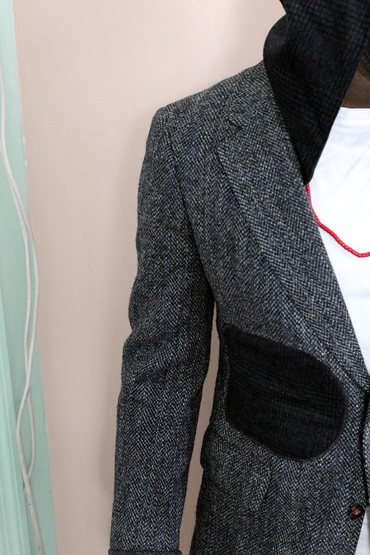 Jacket, Gray wool Tweed Hooded Blazer with wool cuffs, appliques, repurposed, one of a kind. Designed by Wendel Johnston.