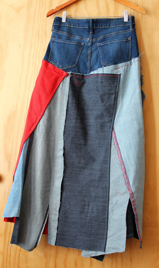 denim with red panel skirt with extra pockets/ stretch denim / waist 30/ hip 39-42 / length 35"/ fun streetwear /one of a kind/made by moi