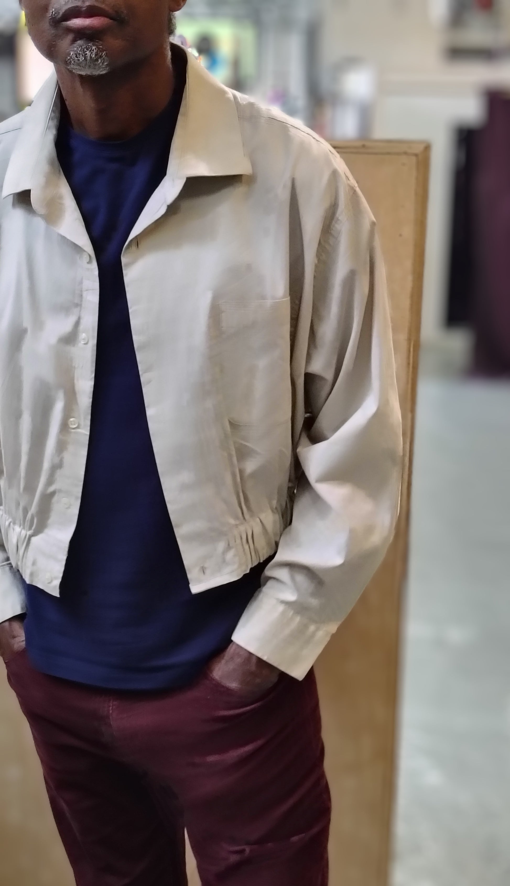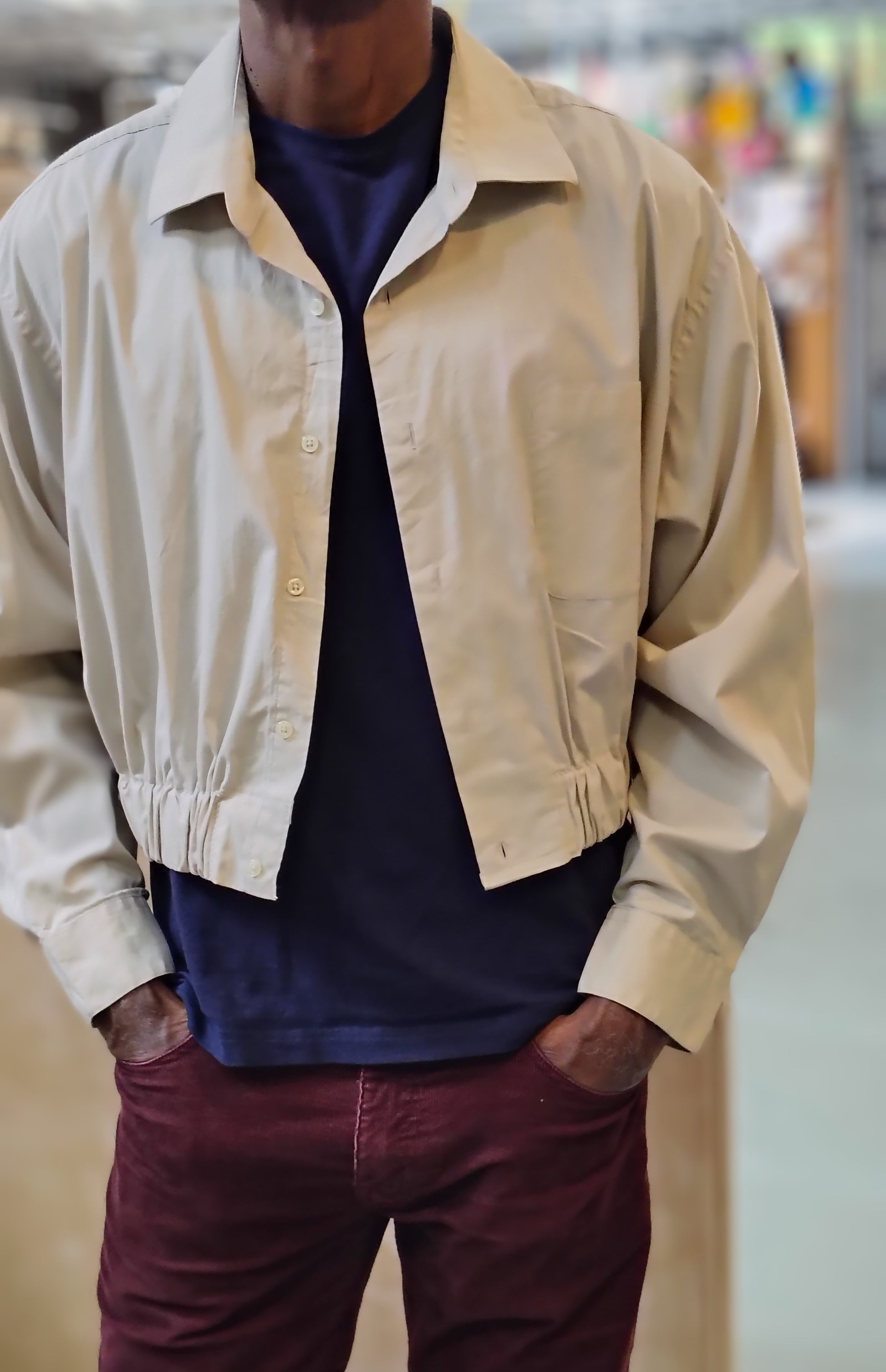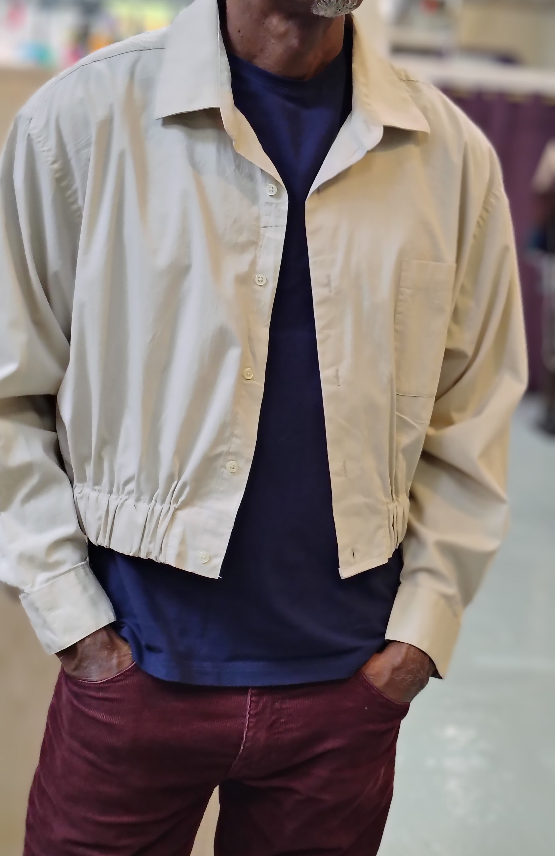 Upcycled cropped button down shirt Unisex. Cotton fabric with 2 inch elastic insert waistband.